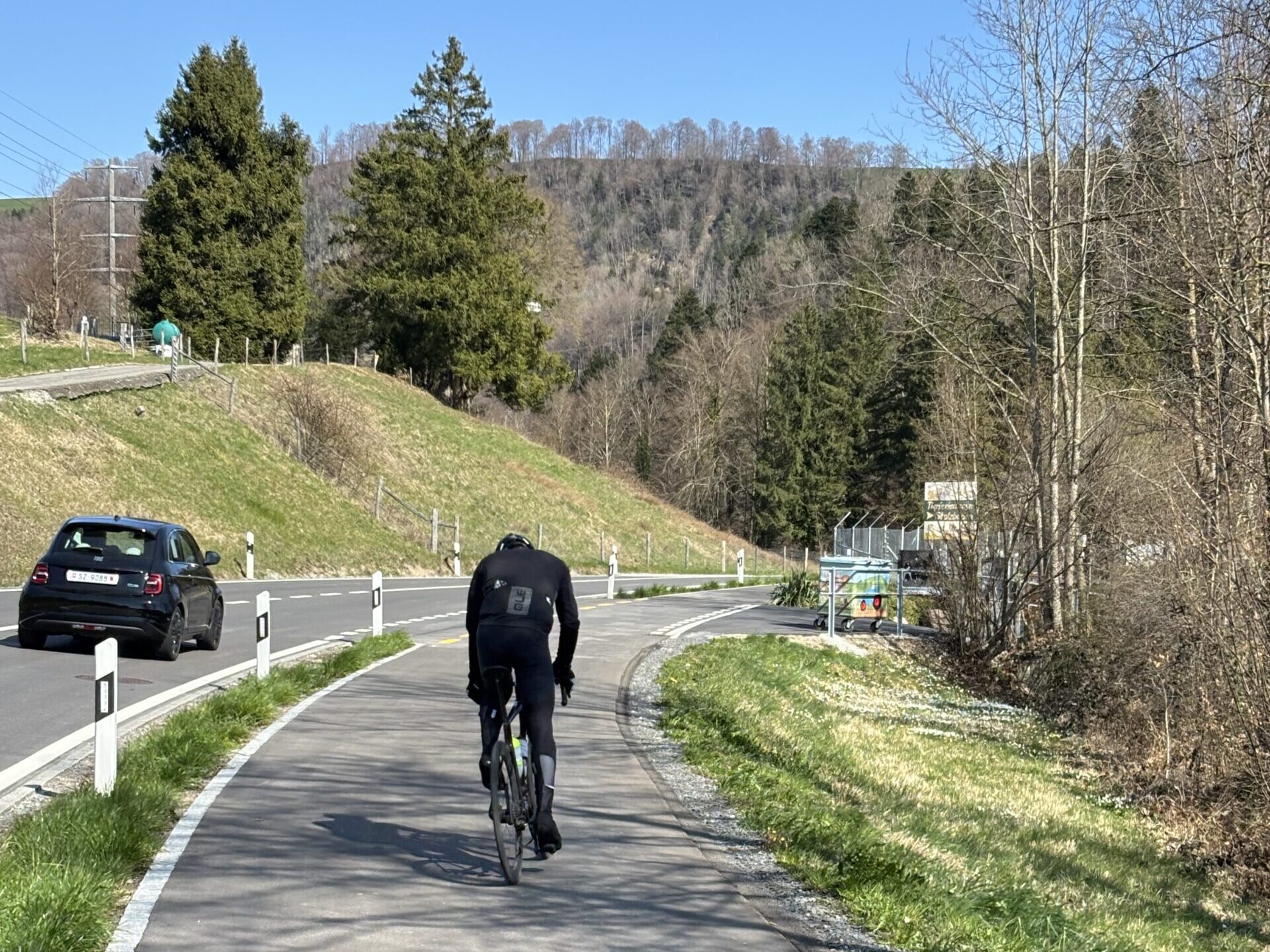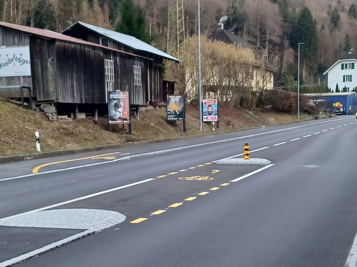 Cette opportunité a été saisie pour repenser la répartition de la chaussée. Ce réaménagement s’appuyait sur la forte baisse du trafic depuis l’ouverture du tunnel d’Uetliberg et de l’autoroute A4. Le trafic journalier moyen est aujourd’hui inférieur à 6’000 véhicules en semaine, soit environ deux-tiers de moins qu’auparavant. Cela a permis de rétrécir la largeur de la chaussée et d’aménager, du côté de la rivière, une nouvelle voie piétonne et cyclable séparée. Grâce au redimensionnement des voies réservées au trafic motorisé, presqu’aucune acquisition foncière n’a été nécessaire. La piste cyclable s’étend sur environ trois kilomètres et mesure 2 m 50 de large. Ce nouvel aménagement sépare la circulation cycliste de la circulation motorisée tout en assurant une liaison piétonne sécurisée.
