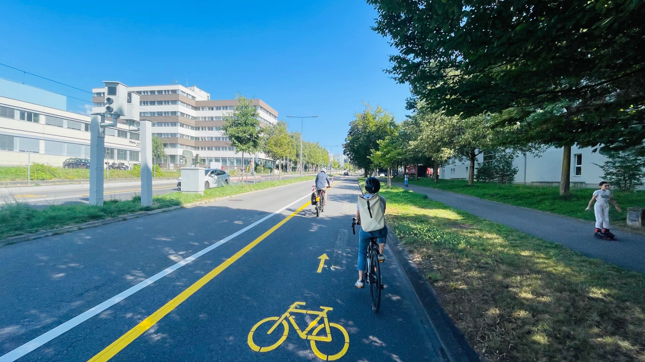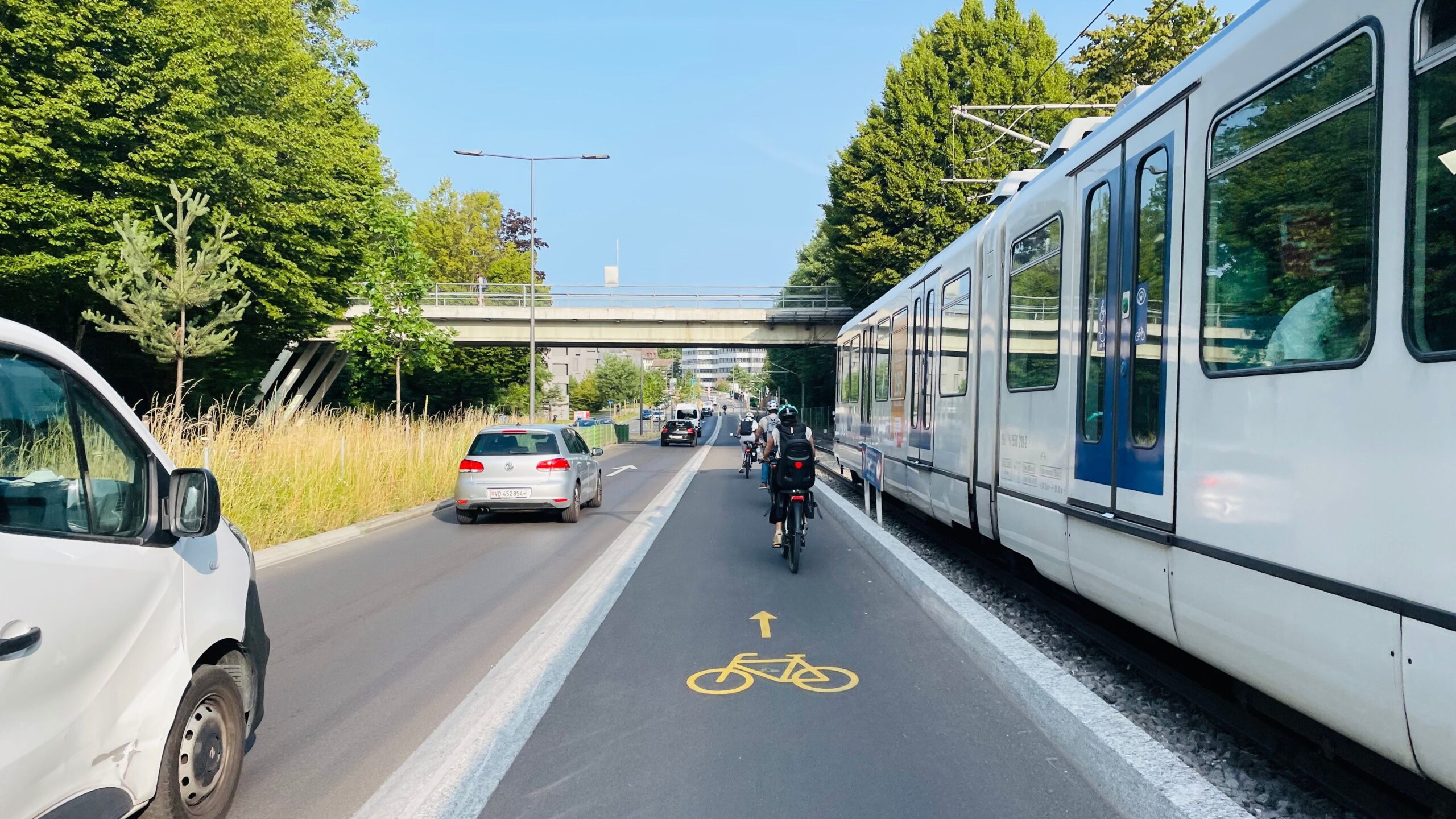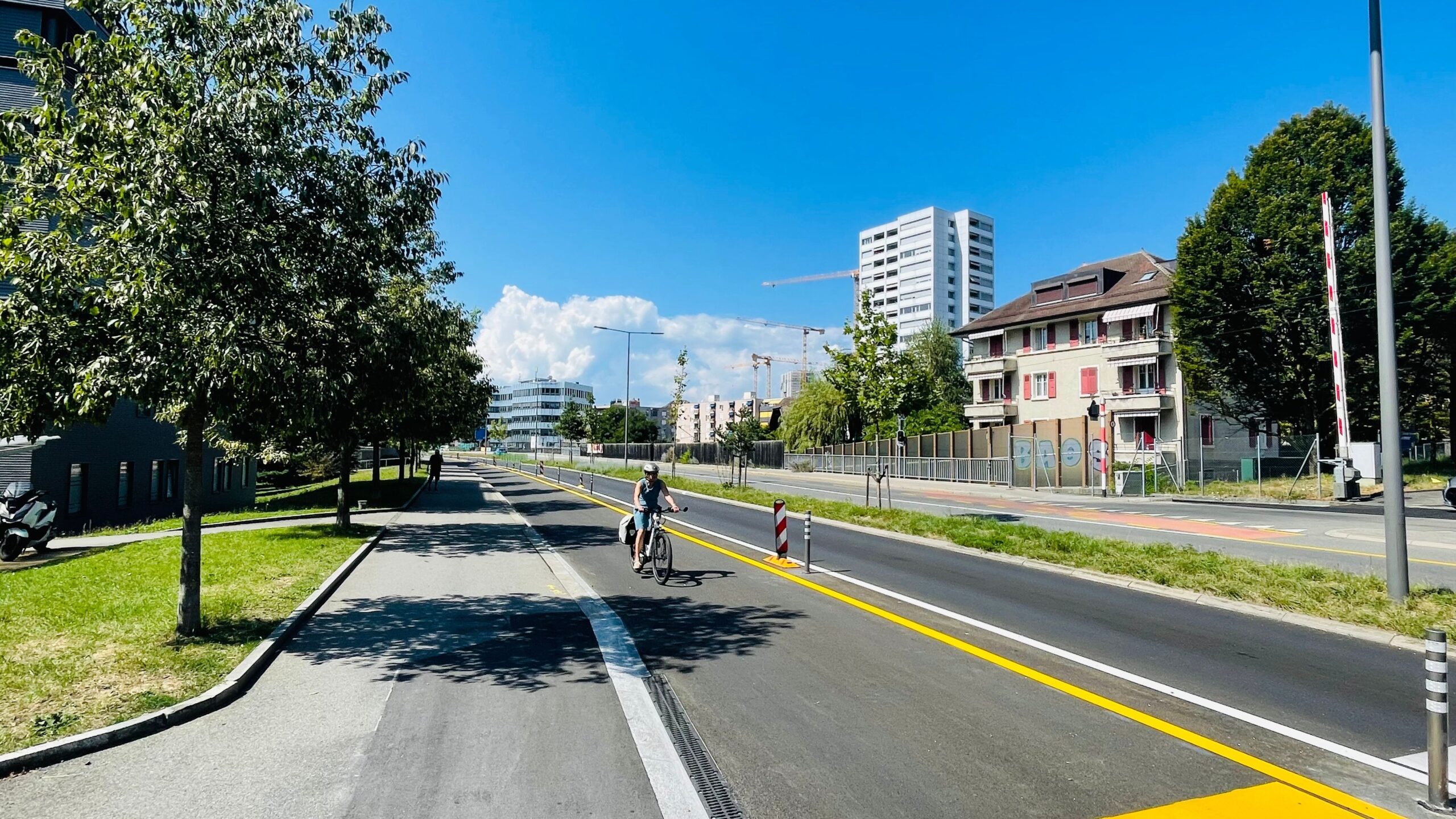 La bande cyclable protégée par des potelets atteigne jusqu’à 5 m de largeur par endroit, et est probablement la plus large de Suisse. (photo : Laurent Dutheil)