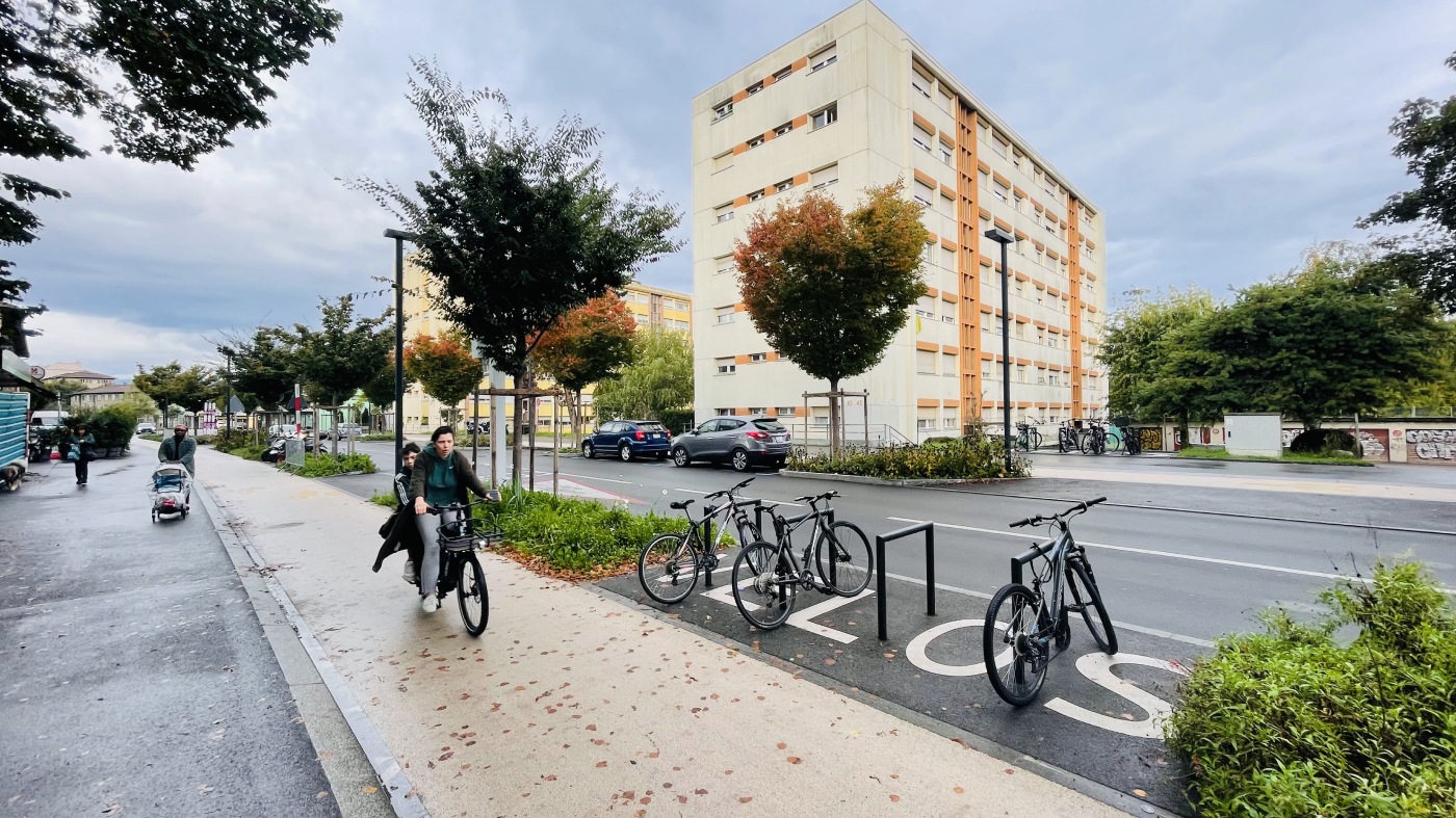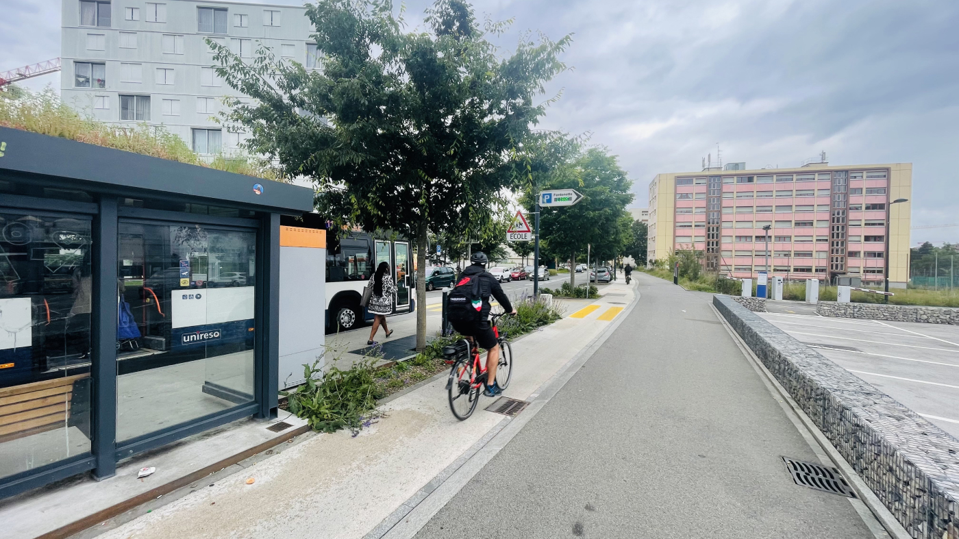 Eine vom motorisierten Verkehr abgetrennte, breite, durchgehende und attraktive Veloführung. Das bietet die Gemeinde Carouge auf der Route de Veyrier. Die Achse, welche zuvor vollständig dem motorisierten Verkehr gewidmet war, wurde dafür radikal umgestaltet.