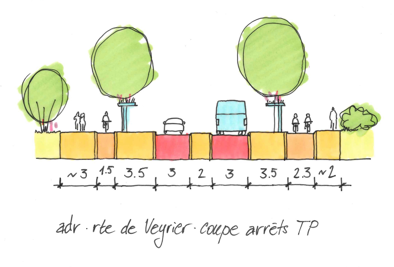 Auf beiden Seiten der Fahrbahn stehen den Velofahrenden 2,30 m zur Verfügung: 1,80 m Veloweg plus 0,50 m Sicherheitsabstand zu den Parkplätzen. Diese bleiben entlang der Fahrbahn bestehen und werden durch Veloabstellplätze ergänzt. So entsteht eine klare Trennung zwischen der Veloinfrastruktur und dem motorisierten Verkehr. Begrünungselemente gliedern die Parkierungsbereiche. Entlang der Route de Veyrier konnten dadurch 80 neue Bäume gepflanzt werden. Die Anlage ist darauf ausgelegt, Konflikte mit Nutzenden des öffentlichen Verkehrs zu vermeiden. Velofahrende umfahren die Bushaltestellen auf der Rückseite, wo der Veloweg zusätzlich auf 1,50 m verengt ist, um Überholmanöver unter Velofahrenden zu verhindern. Niedrig gehaltene Bepflanzung verbessert die Sichtbeziehungen. Die Velowege befinden sich zudem auf einem mittleren Niveau und sind mit abgeschrägten Randsteinen von den Fussverkehrsströmen getrennt. Diese Abgrenzungen weisen die Flächen eindeutig zu und erhöhen die Sicherheit für sehbehinderte Personen. Auch die Haltekanten des ÖV wurden rollstuhlgerecht erhöht. Die Tempolimite für den motorisierten Verkehr ist 50 km/h. Der motorisierte Verkehr teilt sich die Fahrbahn mit dem öffentlichen Verkehr.